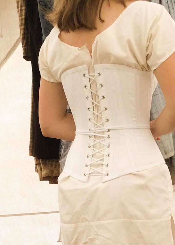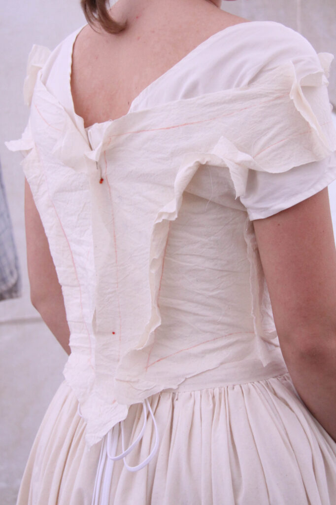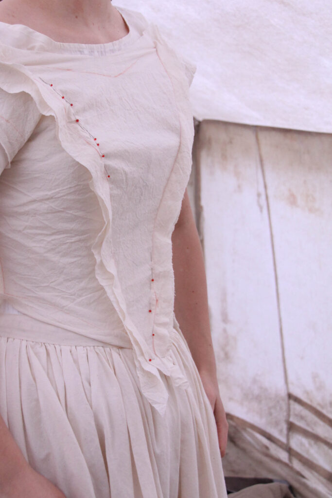 The chemise I’m wearing in this photo, is not the one I’ll be wearing with the dress. Also, don’t mind my extremely large petticoat waistband hanging off my hips. 🙂