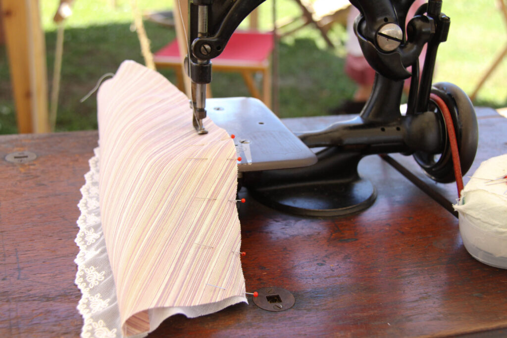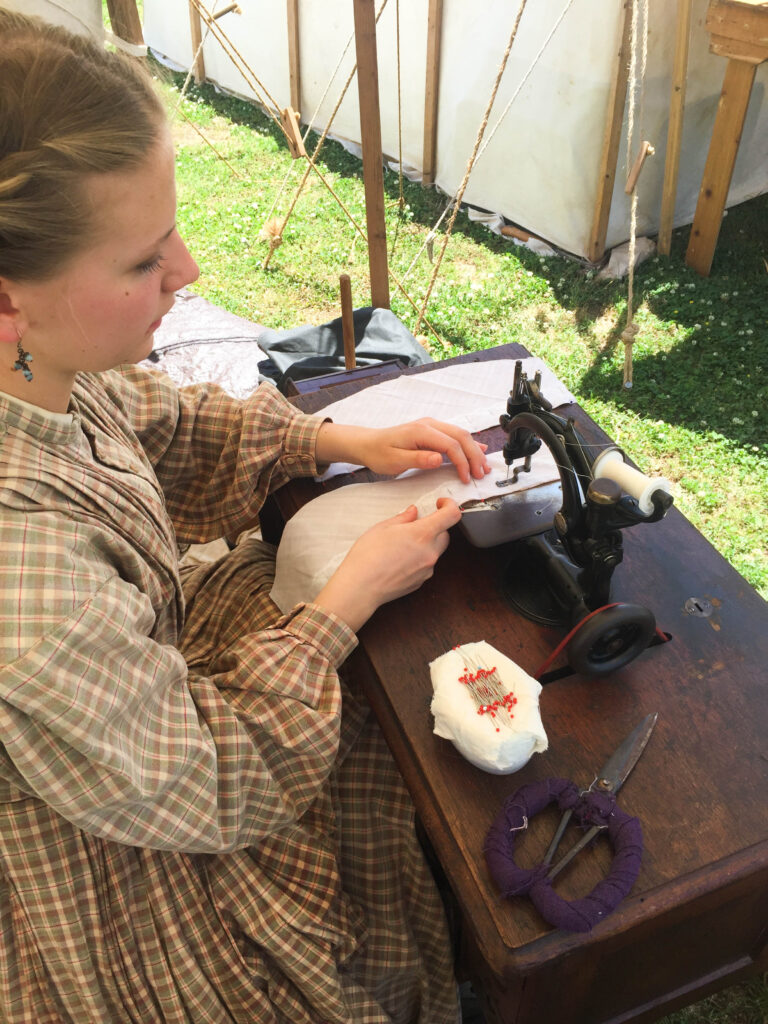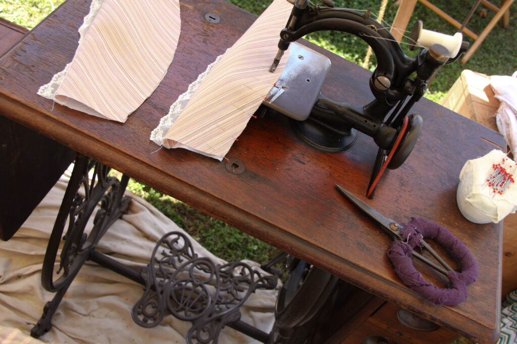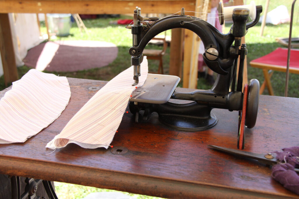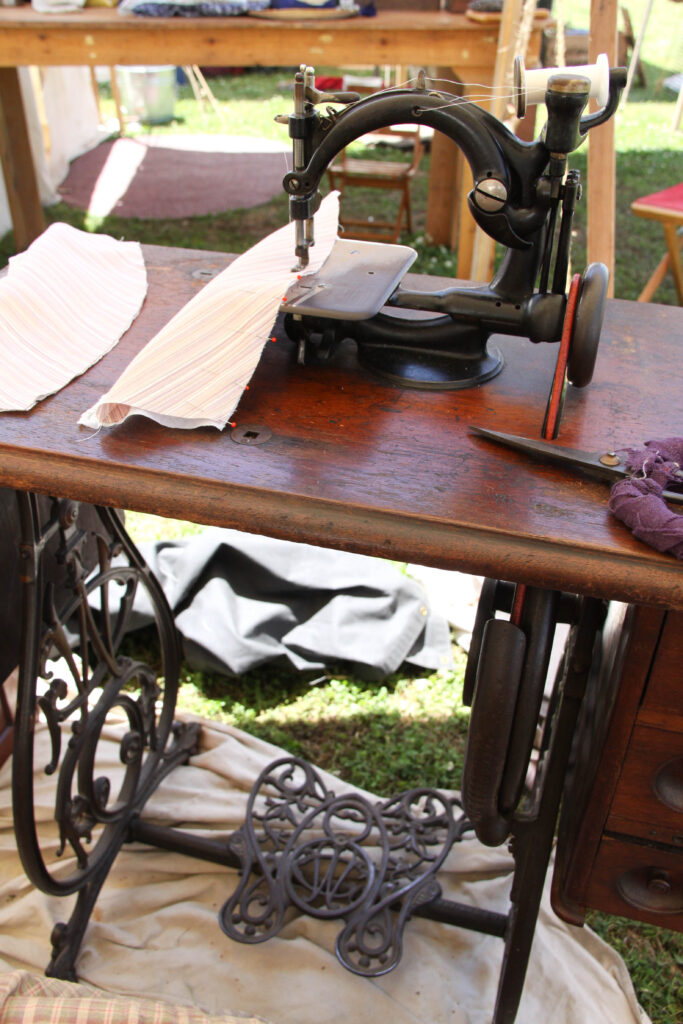 Among the many possessions of reenacting gear, we have a historic treadle sewing machine. Being from the 1880’s, it’s not completely accurate for the 1860’s. Now, we do have another sewing machine that is actually from the 1860’s! This amazing piece of machinery is quite similar to the machine on the treadle from the 1880’s. With that I mind, I have no problem bringing a slightly “new” machine to the 1860’s reenactment seeing as it’s almost the same design as the one’s used during the American Civil War.