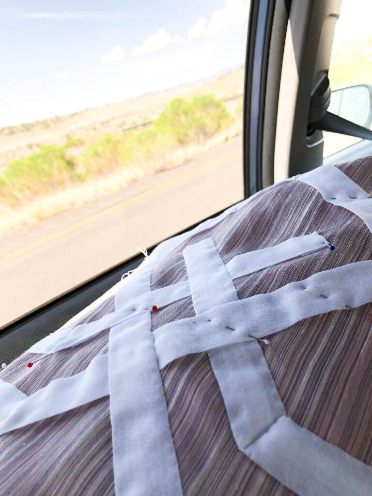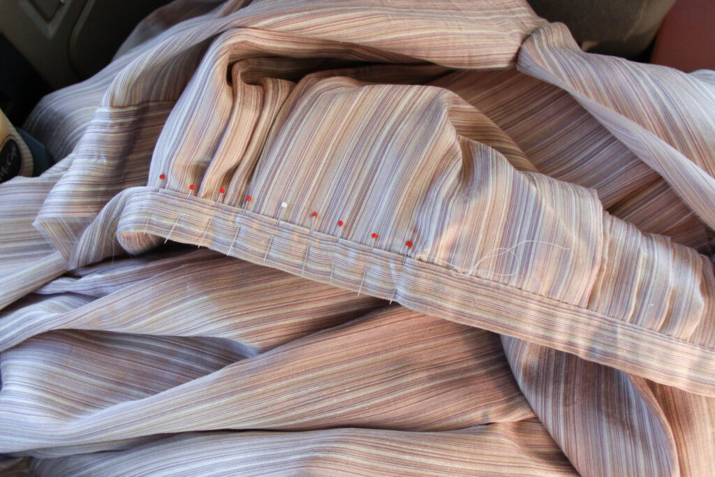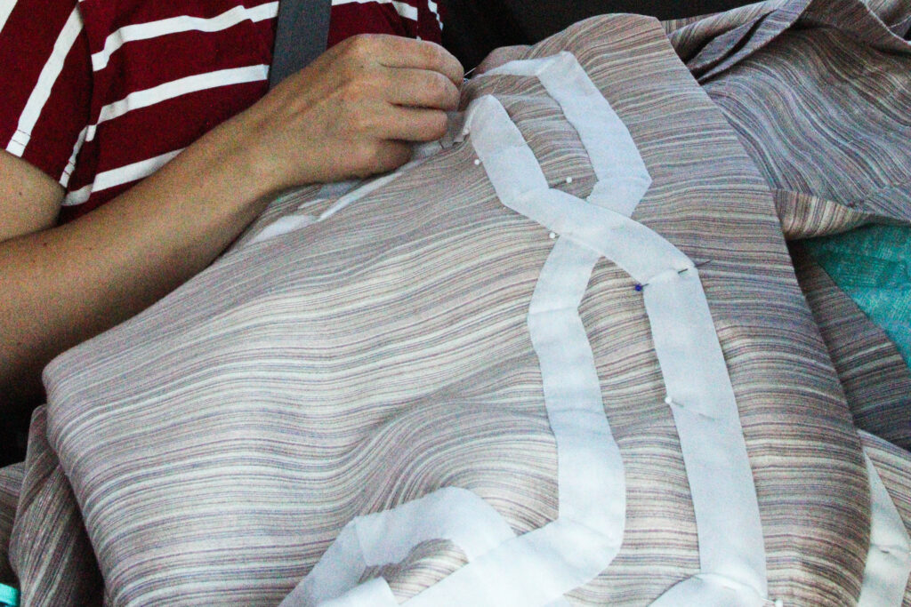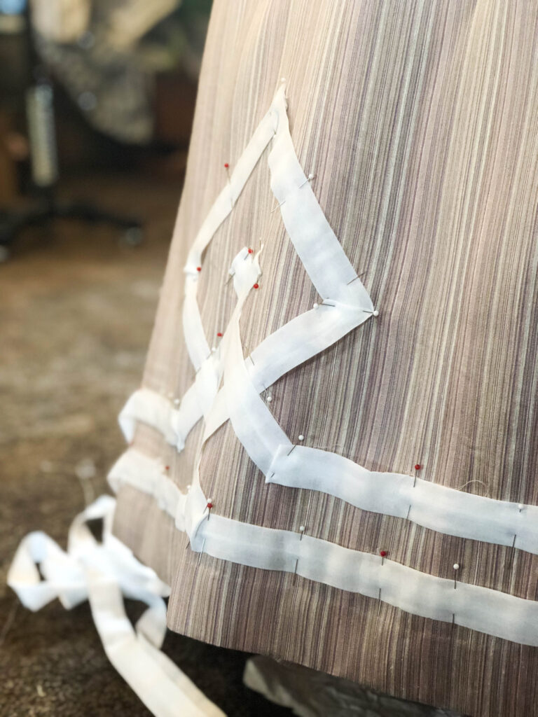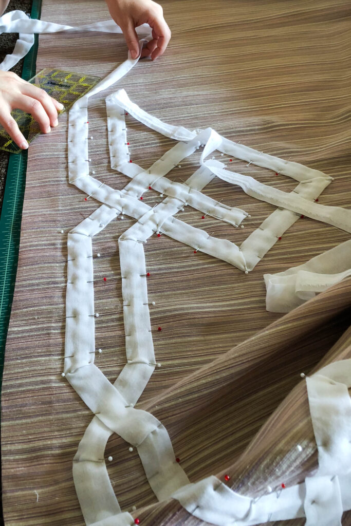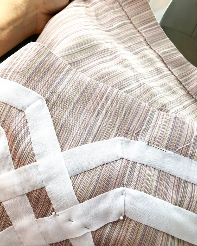 The pinning of twelve repeats took quite some time. To make it more complicated, I couldn’t bring myself to use a sewing machine. It had to be hand-sewn…what was I thinking?