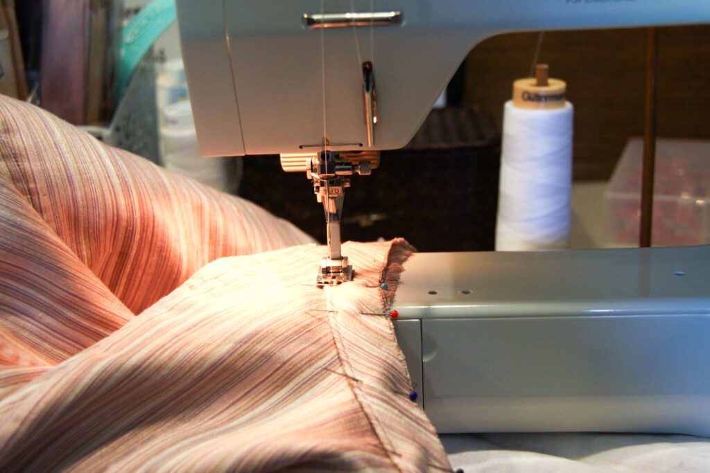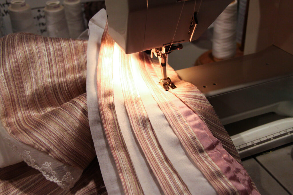 I had picked up the perfect pink striped fabric at Hancock Fabrics during their close out sale. Getting a killer deal, I bought the fabric at $2 per yard! Being a rayon poly blend, it’s not a historically accurate material, but the appearance of the fabric looks a lot like silk. That’s mainly why I decided that it wouldn’t matter too much! Seeing as I hardly go to balls, I would never dream of spending $20+ per yard on a dress that hardly gets worn. It was either no 1860’s ballgown, or a ballgown that looks historically accurate using not-so-accurate fabric.