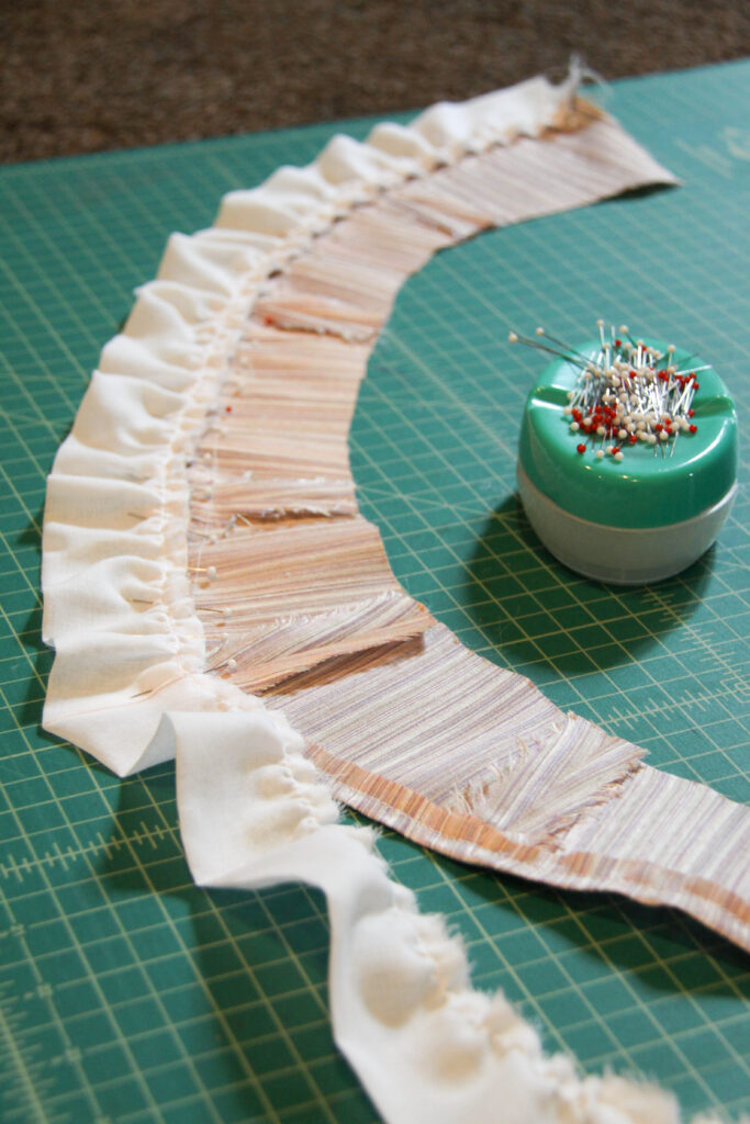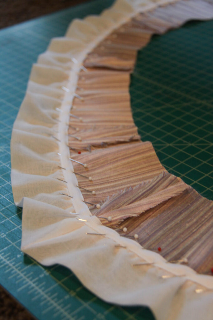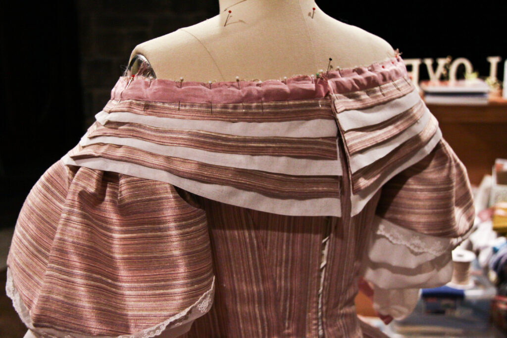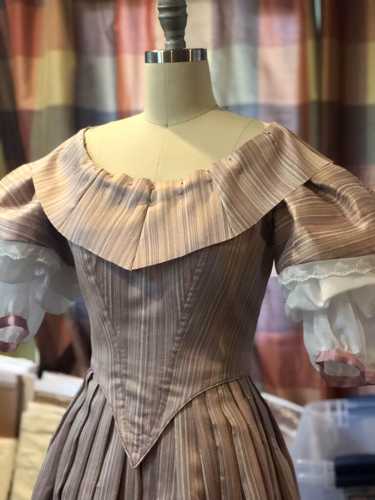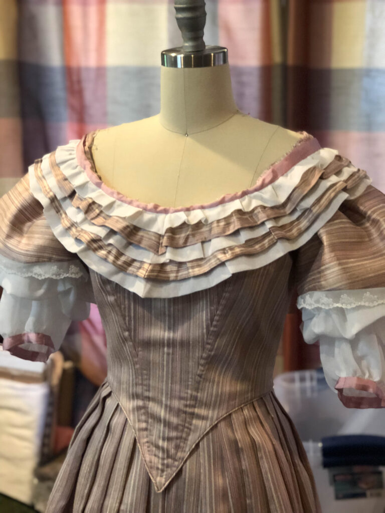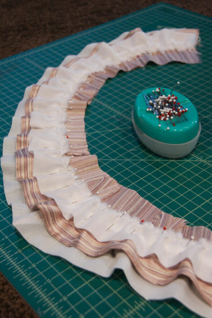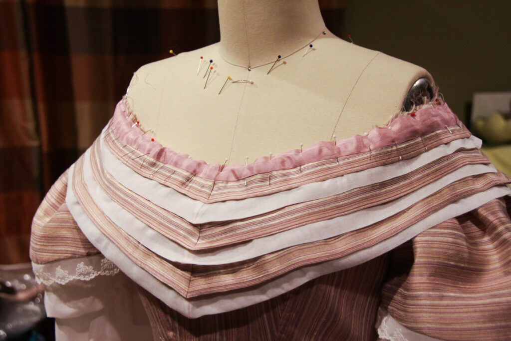Now for the bertha! Originally, I created a ruffled bertha, but after seeing the completed look, I sent a poll to Instagram to let my many followers decide the outcome. Left, the ruffled bertha — Right, the unfinished smooth bertha.