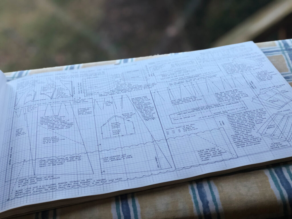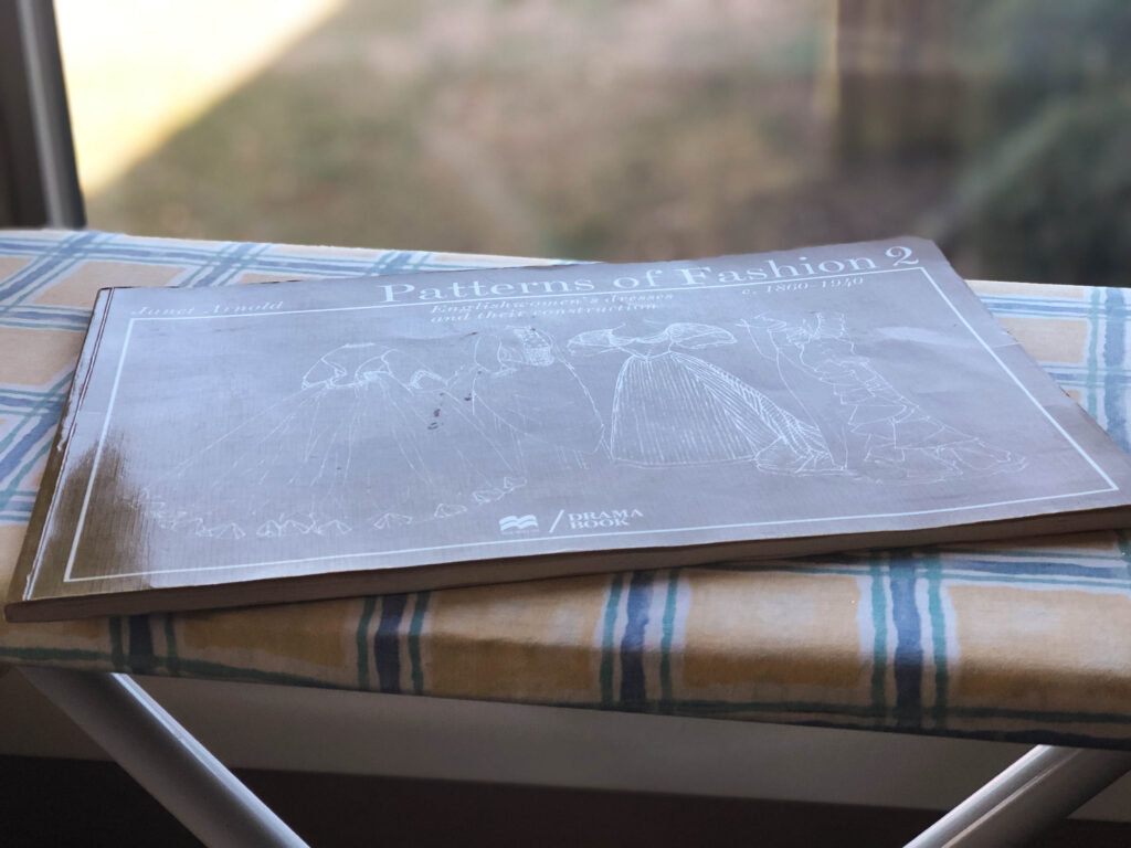 In went the treadle, some muslin, the needed sewing supplies, the main fabric, and Janet Arnold’s “Pattern of Fashion 2.”