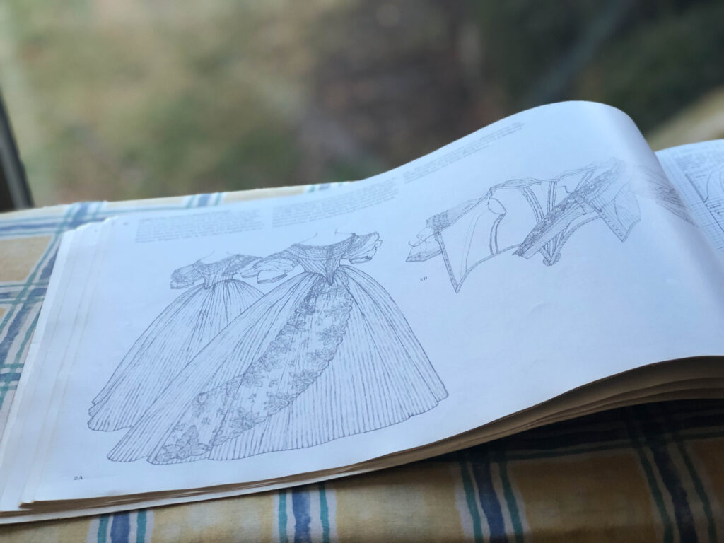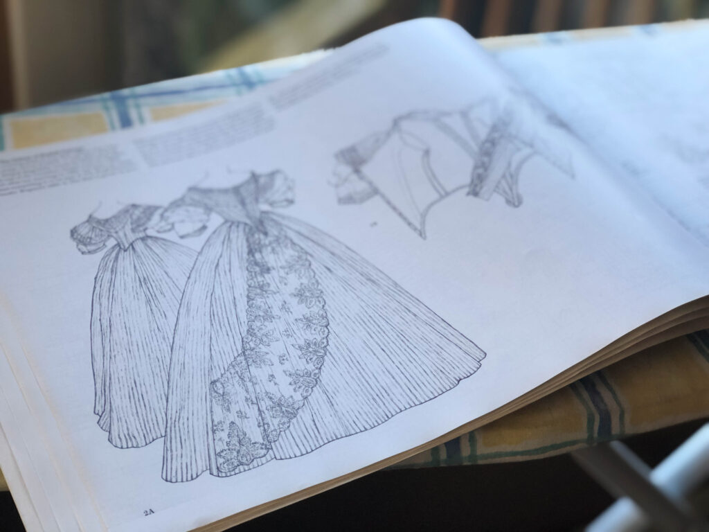 From the first time I saw it, I knew this particular evening gown was exactly the style I desired for my 1860’s ballgown! My plan wasn’t to perfectly replicate it, just to create my dress in a similar way (and use the pattern). Here you can see the pattern…it would be my first time to enlarge a pattern!